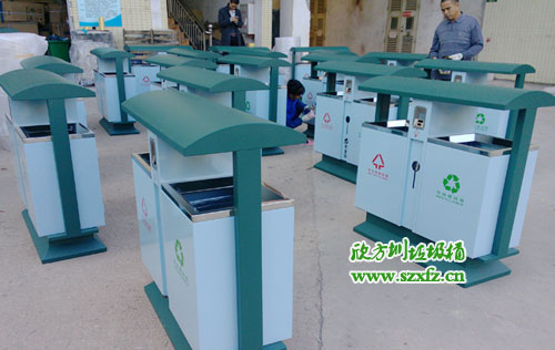 深圳龍崗區街道辦采購F95戶外鋼板分類垃圾桶,按照15天交貨日期,如期完工,送貨上門。此款F95戶外鋼板分類垃圾桶規格為:1000*400*1000.鋼制垃圾桶屋檐桶頭設計,防止雨水傾入內桶。煙頭投口,分類垃圾,隔絕火患。有害投口,充分利用空間。桶兩邊都絲印有,標志,字體,不可回收字樣,采用紅顏色。 標志,字體,可回收字樣,采用綠顏色。巧妙的設計,結合城市人性化,更好服務城市居民。
