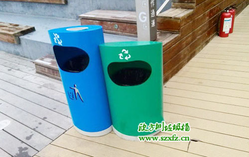 此款F182分類(lèi)環(huán)保垃圾桶,前兩年在我司欣方圳定制過(guò),為歡樂(lè)海岸繼續(xù)輸送垃圾桶。擺放在歡樂(lè)海岸風(fēng)吹日曬幾百天了,依然看不出有啥變化,欣方圳垃圾桶的質(zhì)量,就是這么牛。分類(lèi)環(huán)保垃圾桶規(guī)格為790*380*900mm,采用304不銹鋼烤漆而成,造型獨(dú)特,外觀由兩個(gè)高矮不一顏色各異的圓形垃圾桶組成,其中綠色桶偏矮為可回收垃圾桶,藍(lán)色桶偏高為不可回收垃圾桶,整體精致美觀。