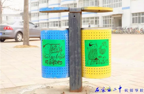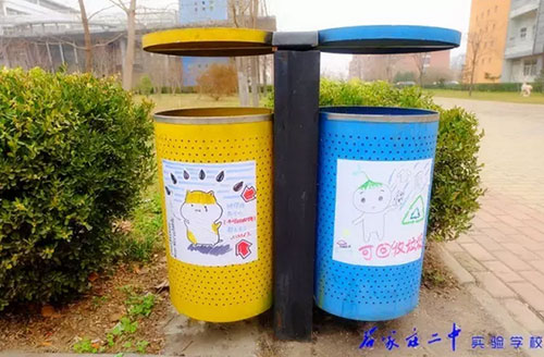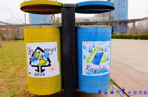 2016年3月18日,石家莊二中實驗學(xué)校2015級高一11班全體66名同學(xué)利用班級值周的時間,手繪百幅垃圾分類標(biāo)志,為校園垃圾桶換上了“新裝”。18日上午,高一11班教室內(nèi),66位同學(xué)拿起五顏六色的水彩筆,在紙張上設(shè)計出各種各樣的“垃圾分類”標(biāo)識和警示語,內(nèi)容涵蓋了分類標(biāo)志、垃圾擬人、科普漫畫等,圖面生動有趣。次日下午,同學(xué)們又從教室奔向校園每個角落,將精心繪制的圖案張貼在校內(nèi)所有的垃圾桶上,提醒過往師生將垃圾分類,維護我們共同的家園。