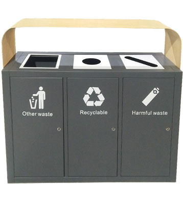 中山市政園林綠化工程定制的這款卡通風(fēng)格造型的戶外垃圾桶,紅、灰、藍(lán)三色分別用于有害垃圾、其他垃圾、可回收物垃圾分類收集使用,優(yōu)質(zhì)鍍鋅板金屬烤漆,帶宣傳欄平臺底座絲印“垃圾不落地,環(huán)境更美麗