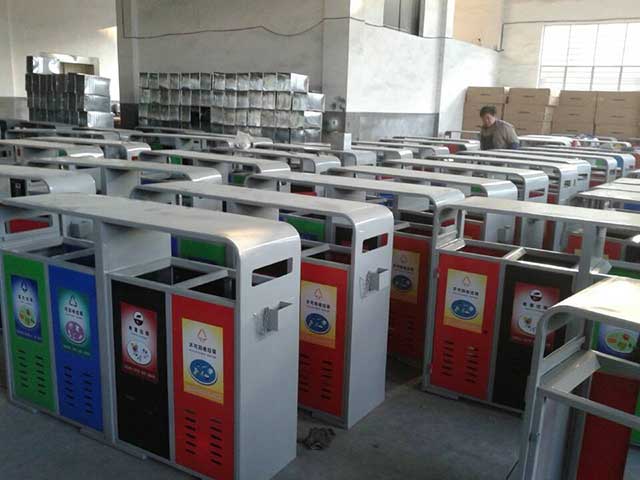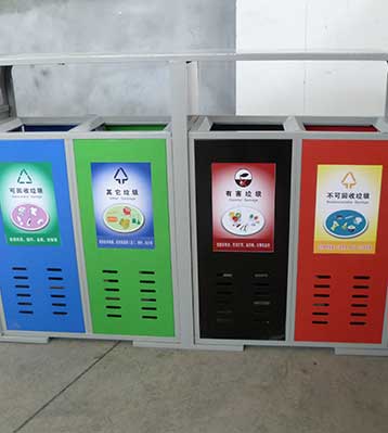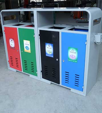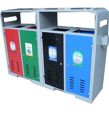 欣方圳鋼制戶外四分類垃圾桶產品一律用室外粉靜電噴塑,經過180°的高溫