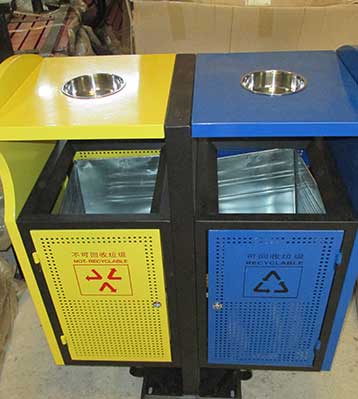 鋼制分類環保垃圾桶均選用優質的冷軋鋼板經噴砂處理去油去銹后,鋼板表面抗紫外線丙稀酸油漆多層噴涂,沖孔通風效果好桶內干爽防銹蝕。