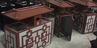 中國(guó)風(fēng)戶外垃圾桶采用優(yōu)質(zhì)標(biāo)厚冷軋鋼板制作,酸洗磷化噴塑防腐能力提高5倍,桶身中國(guó)風(fēng)設(shè)計(jì),垃圾分類標(biāo)識(shí)醒目,高精度打磨拋光不割手。