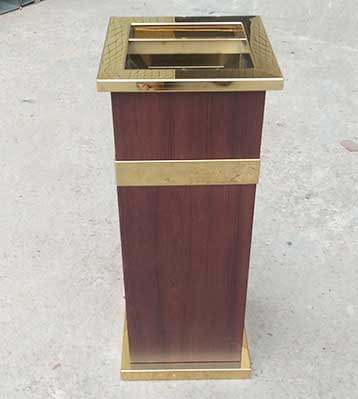 • 產品材質:酒店鈦金垃圾桶采用不銹鋼鋼板拉絲咖啡色或玫瑰金制作而成,另產品可做四面大理石用鋼板螺絲固定于桶體,有內桶,方便提倒垃圾,桶頭煙灰盅可放白石子可清洗,鋼板經折彎沖壓一次性成型。產品一律用室外粉靜電噴塑,經過180°的高溫,延長垃圾桶使用壽命,顏色持久不變亮麗如新。