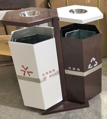六角設計創意美觀,采用優質冷軋鋼板一次沖壓成型整體堅固耐用,咖啡色和白色戶外粉高溫烤漆防銹防腐蝕能力強,交錯搭配有助垃圾分類投放。