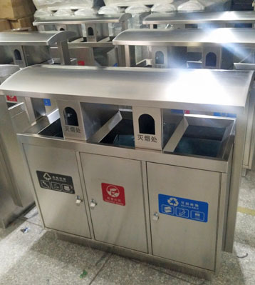 羅湖城管局采購擺放羅湖火車站三分類不銹鋼垃圾桶整體外型為不銹鋼原色,材質采用201優質不銹鋼制作,專業焊接打磨成型。