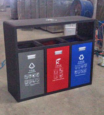 • 產品材質:街道戶外三分類垃圾回收箱采用優質冷板噴塑,足0.8mm厚度外筒,鍍鋅板內筒0.4mm,貼戶外噴繪高檔美觀,可按不同地區垃圾分類要求,絲印可回收物(RECYCLABLE WASTE)、有害垃圾(HAZARDOUS WASTE)、濕垃圾(HOUSEHOLD FOOD WASTE)、干垃圾(RESIDUAL WASTE)等分類標。