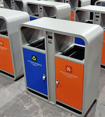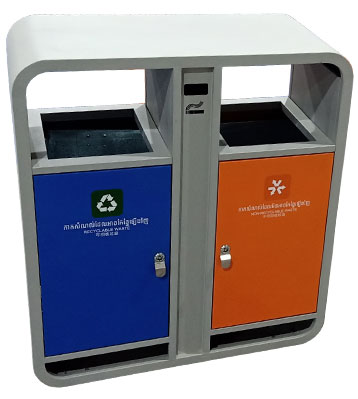外筒鍍鋅板框架噴戶外淺灰色塑粉高溫烤漆,門板做藍色和橙色烤漆,分別對應可回收物和其他垃圾并絲印分類標,內筒與底座做隔層防潮,整體戶外擺放防銹耐用。