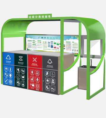 設有擋雨棚,可配備垃圾箱信息顯示屏、防水照明燈、廣告屏,進行地面硬化。對社區玻金塑紙可回收物,其他垃圾,廚余垃圾,有害垃圾等生活垃圾定時定點投放收集.